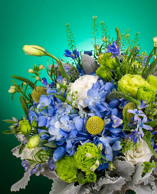 Dive into a world where the cool blue hydrangea takes center stage, its lush petals reminiscent of serene ocean waves. Complemented by a medley of fresh greens, this bouquet is a refreshing sight, evoking feelings of tranquility and peace.